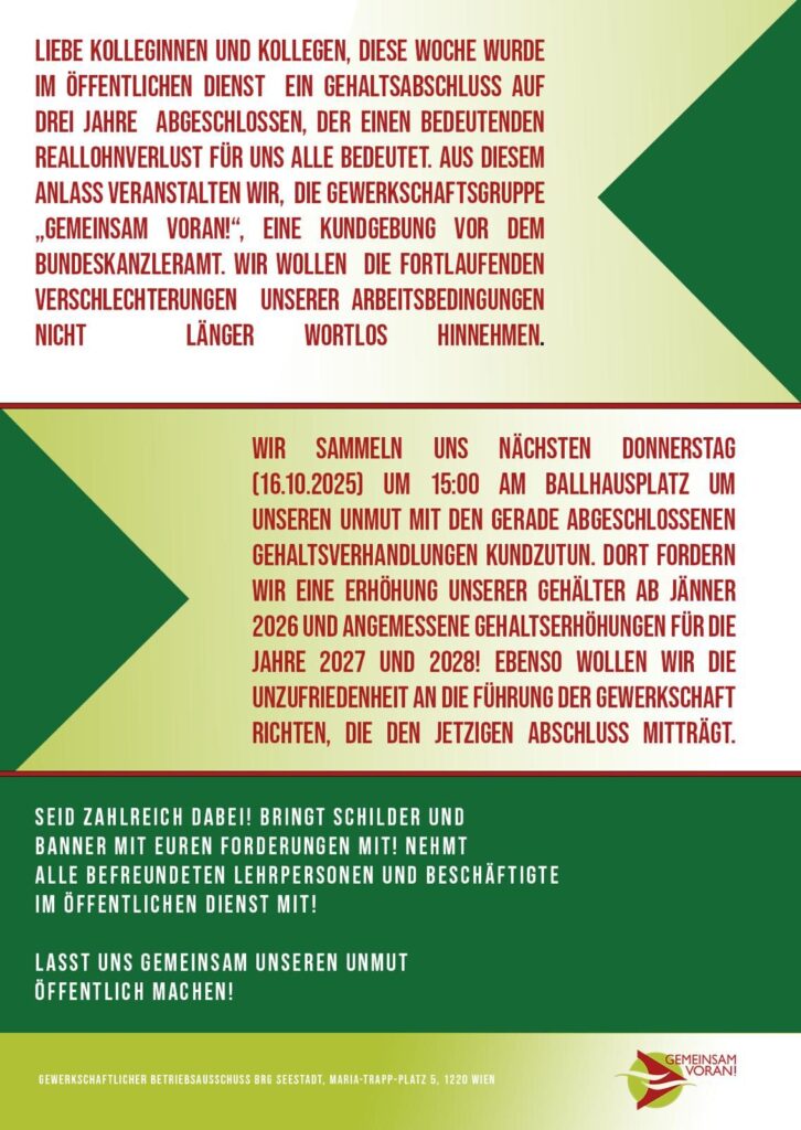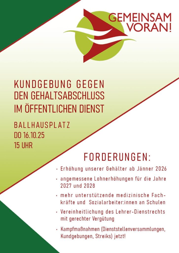 Wien. In Reaktion auf den kürzlich abgeschlossenen Gehaltsabschluss im Öffentlichen Dienst ruft die Gewerkschaftsgruppe „Gemeinsam Voran!“ zu einer Kundgebung vor dem Bundeskanzleramt auf. Der Abschluss, der für drei Jahre gilt, bedeutet laut vielen Beschäftigten einen massiven Reallohnverlust – in einer Zeit, in der die Lebenshaltungskosten weiter steigen und die Arbeitsbelastung im öffentlichen Sektor zunimmt.