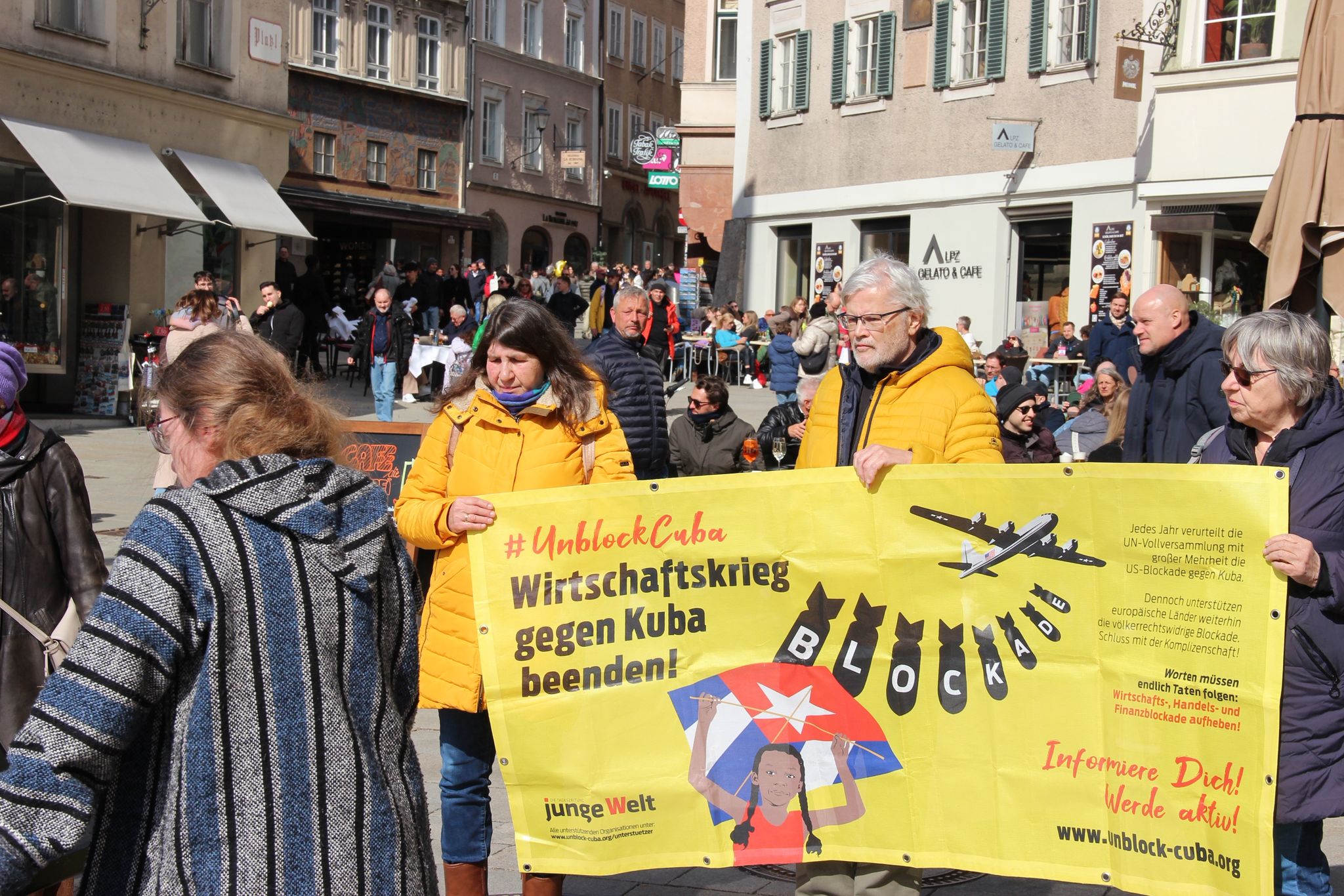 Salzburg. „Y en eso llegó Fidel“ („und da kam Fidel“) ertönte am Samstag die Stimme des kubanischen Sängers und Liedermachers Carlos Puebla am Platzl in der Linzergasse. Puebla schrieb das Lied nach dem Sieg der kubanischen Revolution, um Revolutionsführer Fidel Castro zu ehren. In Anbetracht der aktuellen Drohgebärden der USA gegenüber Kuba organisierte die Österreichisch-Kubanische Gesellschaft (ÖKG) eine Kundgebung unter dem Motto „Hände weg von Kuba“, um auf die Situation in Kuba aufmerksam zu machen. „Es fehlt an Medikamenten, Treibstoff und weiteren überlebenswichtigen Dingen. Die USA wollen die Insel erdrosseln“, so ein Teilnehmer der Kundgebung gegenüber der Zeitung der Arbeit. Mit der Executive Order 14380 vom 29. Jänner hat die Trump-Regierung Kuba vollständig von Öllieferungen abgeschnitten. Seitdem kommt es zu Stromausfällen und Engpässen auf der gesamten Insel.